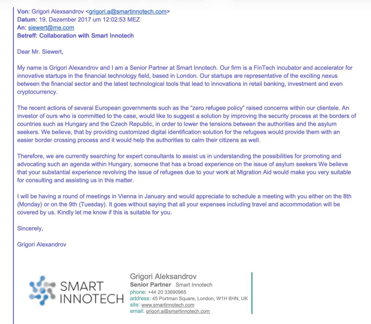 19. decembra 2017 sem na svoj osebni e-poštni naslov prejel sporočilo. Pošiljatelj se je predstavil kot Grigori Alexsandrov in zapisal, da se name kot na predstavnika Migration Aid obrača v imenu londonskega podjetja Smart Innotech. Na sporočilo nisem takoj odgovoril, vendar mi je naslednji dan poslal še eno.