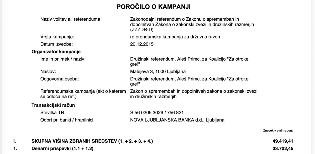 Kot izhaja iz poročila, Primčeva koalicija ni imela nobenih drugih stroškov s kampanjo. Pod črto: civilnodružbena organizacija, ki je zbrala podpise za referendum, v poznejši kampanji ni porabila niti evra za stojnice, shode, pripravo, tiskanje in razdeljevanje promocijskega materiala, delom na terenu in oglase v medijih. Kdo je torej vse to v resnici plačal?
