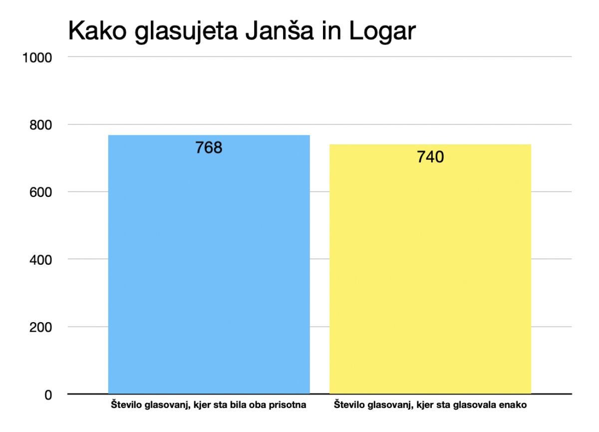 Drugih glasovalnih neskladij med Logarjem in Janšo v treh letih in pol ni bilo. Pod črto: skupaj sta enako glasovala 740-krat, različno pa le 28-krat.