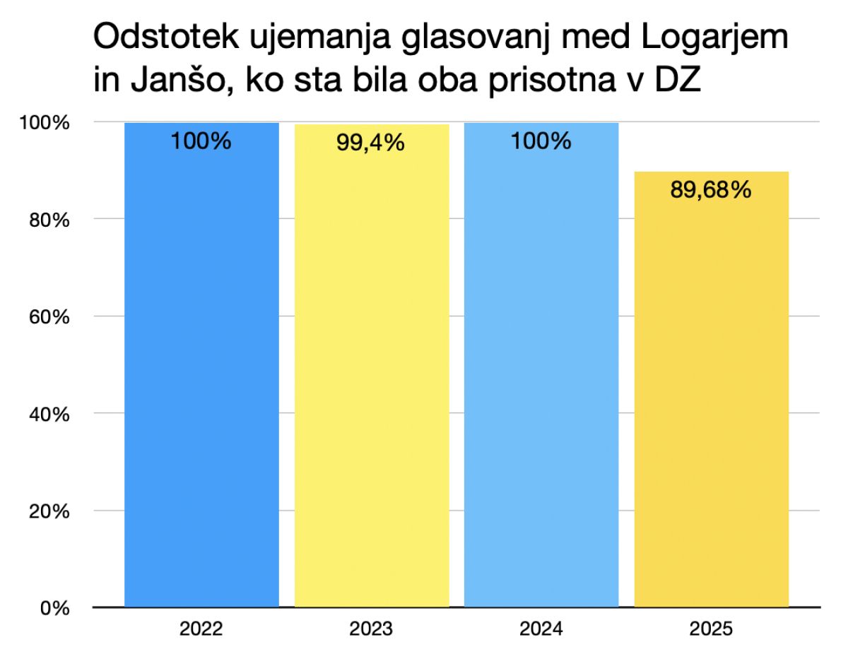 Pri analizi nas je najbolj zanimalo, ali Logar v parlamentu res glasuje drugače od SDS. Primerjali smo glasovanja med Logarjem in Janšo, ko sta bila oba prisotna v državnem zboru, in to v letih med 2022 in 2025. Letošnjega januarja še nismo zajeli v analizo.