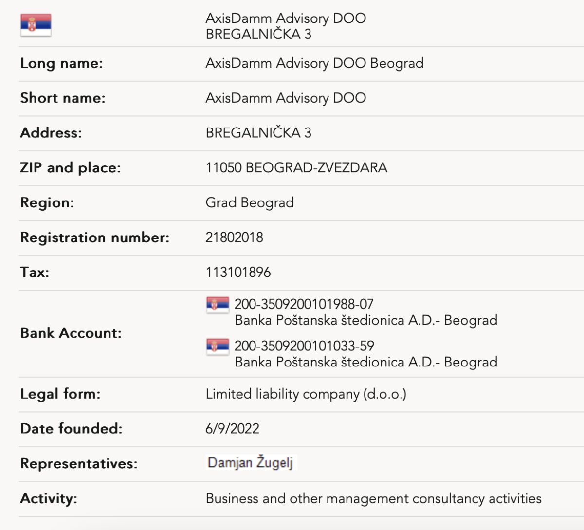 Že v začetku junija 2022 je Žugelj v glavnem mestu Srbije odprl svetovalno podjetje AxisDamm, ki praktično ne posluje. V prvih nekaj mesecih je ustvarilo 7.000 evrov prihodkov. Medtem v letih 2023, 2024 in 2025 ni zabeležilo niti enega evra prometa. Kljub temu ima odprta dva bančna računa.