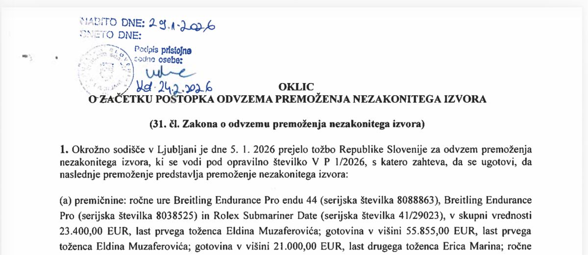 To je razvidno iz oklica o začetku postopka, ki ga je pred dnevi javno objavilo okrožno sodišče v Ljubljani. Tožbo je vložilo tudi proti osmim fizičnim osebam iz Slovenije in Bosne in Hercegovine (BiH), med katerimi sta Muzaferovićeva sorodnika. Z njo želijo tožilci trajno odvzeti tudi premoženje, ki so ga kriminalisti obtoženim zasegli med hišnimi preiskavami v marcu 2024 in v novembru 2024 – tik pred umorom državljana BiH Satka Zovka na obrobju Ljubljane, za katerega je slovenska policija osumila in aretirala Muzaferovića.