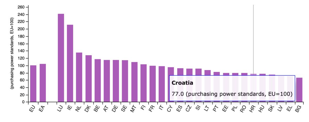 Ljudje v Sloveniji v povprečju zaslužijo več kot na Hrvaškem, a so tam cene življenjskih potrebščin in storitev nižje kot v Sloveniji. Za enako količino denarja torej kupijo več kot bi lahko, če bi z istim zneskom živeli v Sloveniji.