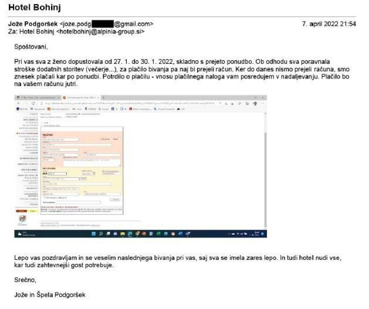 Toda na laž so ga postavili v KŽK, od koder so nam posredovali tako račun, ki so ga morali poravnati, kot tudi elektronsko korespondenco s Podgorškom. "Minister nikoli ni izrazil želje ali namere, da bi stroške bivanja poravnal osebno, to je storil šele štiri mesece kasneje po izbruhu medijske afere in potem, ko je od hotela zahteval, da že plačani račun stornirajo," so navedli v KŽK.