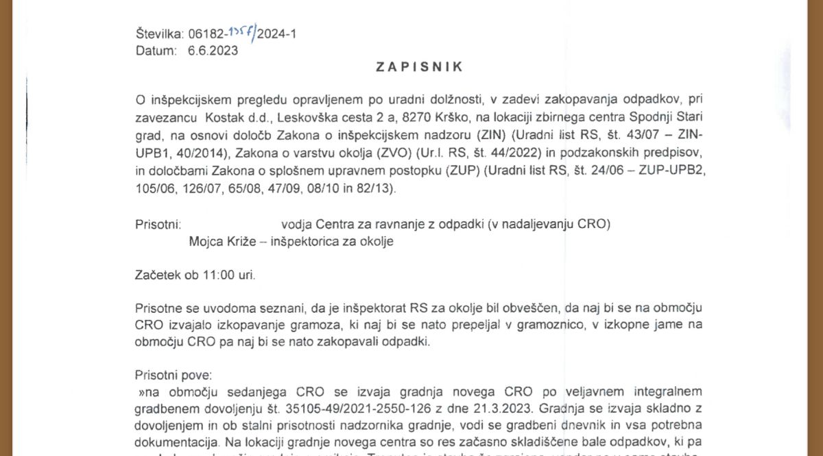 Povzeto: v Kostaku so inšpektorici zatrjevali, da odpadke po območju premikajo zaradi del na gradbišču. Nato je inšpektorica, tako zapisnik, opravila "vizualni pregled" lokacije. In "ugotovila, da zavezanec ne zakopava odpadkov, temveč jih samo odmika glede na potreben prostor za gradnjo novega centra".