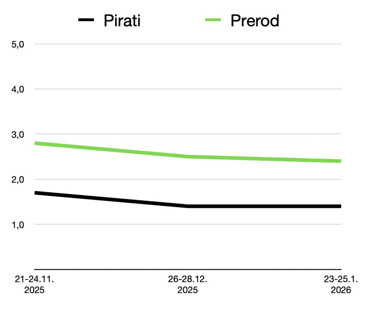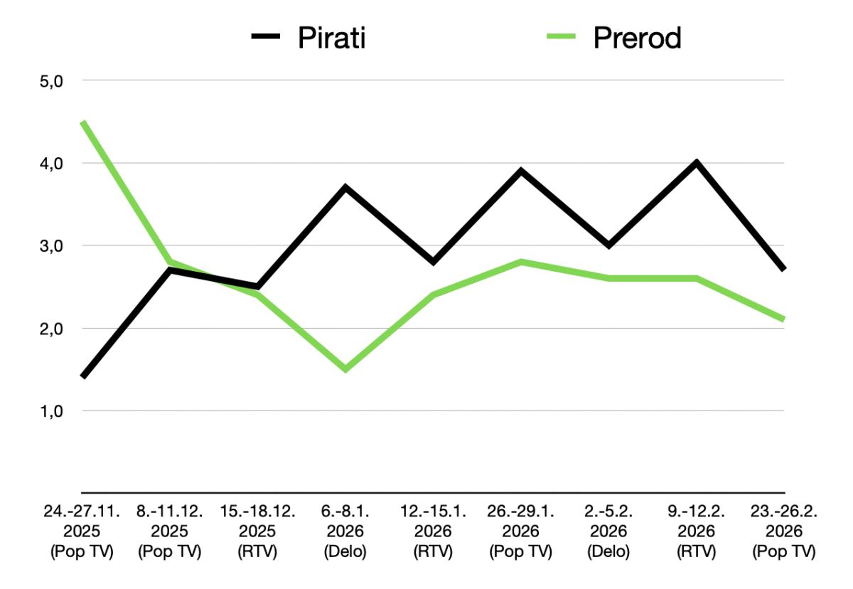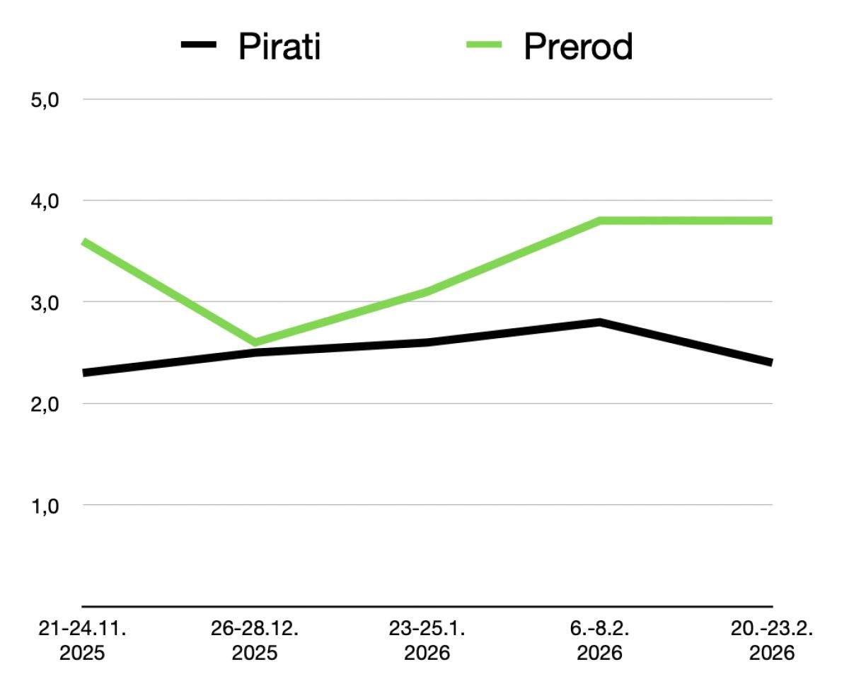 Poglejmo številke. 1. februarja je bila na Pop TV objavljena tretja anketa Mediane. Takrat je povprečje glasov kazalo, da so na 7.-9. mestu Resni.ca (3,6 odstotka), Prerod (3,1 odstotka) in Pirati (2,6 odstotka). Ta vrstni red je spremenila šele najnovejša anketa, v kateri so Pirati (2,9 odstotka) naenkrat prehiteli Prerod (2,7 odstotka).