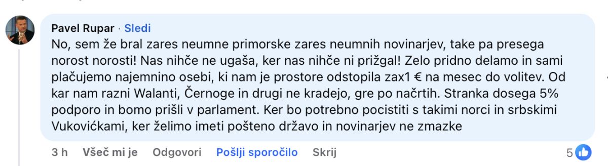 To je Rupar priznal na družbenem omrežju Facebook. "Zelo pridno delamo in sami plačujemo najemnino osebi, ki nam je prostore odstopila za en evro na mesec do volitev," je Rupar zapisal v odzivu na naš torkov članek. V njem smo se spraševali, od kod Ruparjevi stranki in inštitutu, ki imata minimalne prihodke, denar za več kot 100 kvadratnih metrov velike prostore v zgradbi, kjer najemnina znaša od 10 do 20 evrov na kvadratni meter.