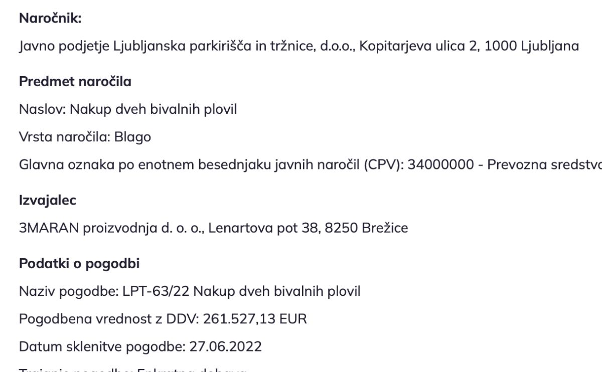 Kmalu zatem je javno podjetje LPT, ki je v lasti ljubljanske občine, takrat pa ga je vodil Andrej Orač, objavilo javni razpis za "nakup dveh bivalnih plovil". Kot edino se je nanj prijavilo podjetje 3Maran in tudi dobilo posel. Po dogovoru je javno podjetje za plavajoči hiški plačalo 261 tisoč evrov (z DDV).