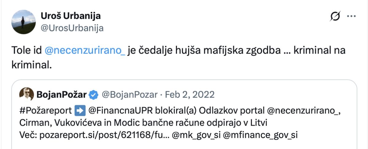 Tako še vedno čakamo, kaj bo na sodišču povedal Urbanija, ki je od zapisa na omrežju X do danes zamenjal že tri službe. Med vodenjem urada za komuniciranje in Planet TV je bil namreč dobro leto dni tudi direktor TV Slovenija, ko je ta javni zavod še obvladoval svet s podporniki nekdanje vladajoče stranke. V odgovoru na našo tožbo je Matoz zapisal, da zapis Urbanije o "kriminalu na kriminal" in druge navedbe ne predstavljajo vrednostne sodbe, ampak "razpravo o mediju".