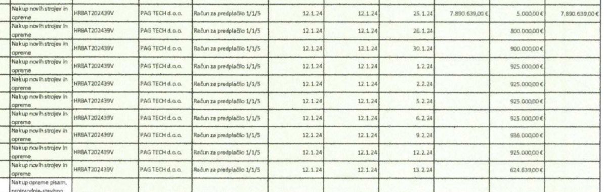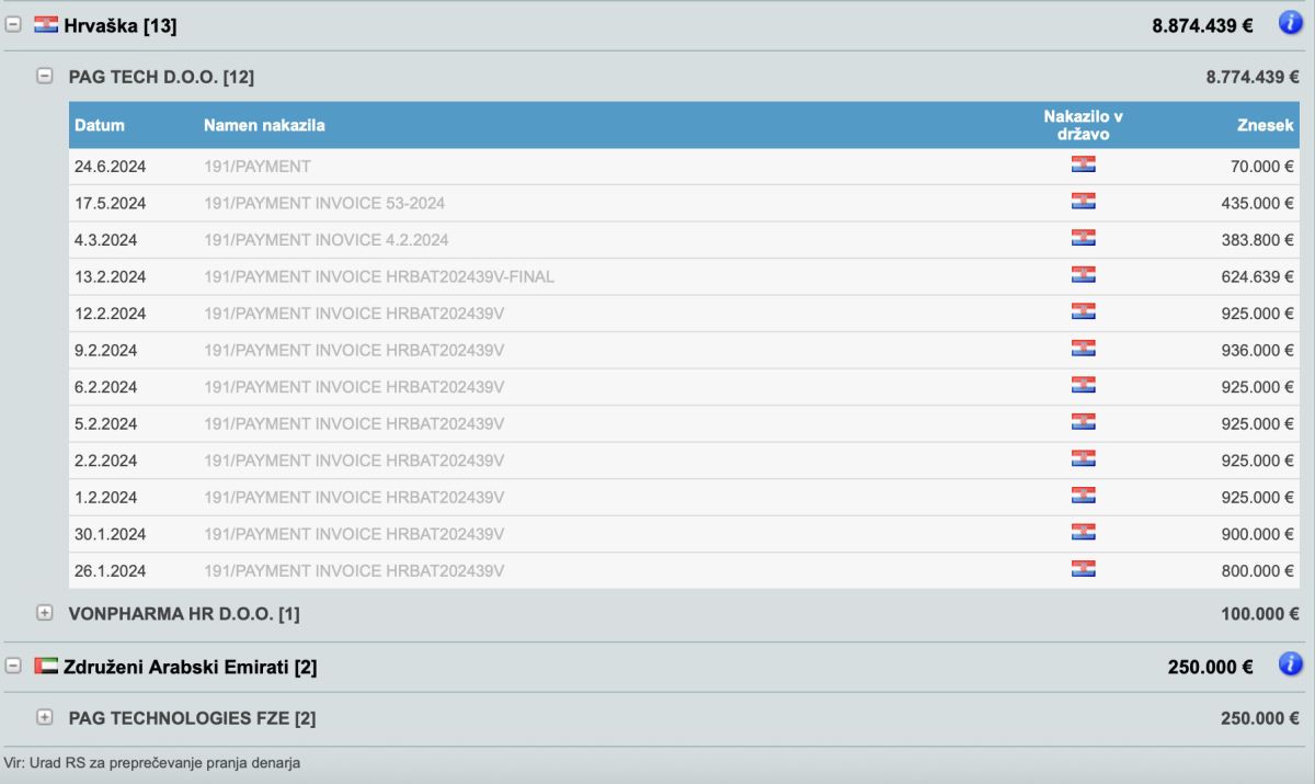 Med januarjem in junijem 2024 je podjetje Vonpharma SI nakazalo skoraj devet milijonov evrov na račun podjetja Pag Tech. Velika večina nakazil se je zvrstila v obdobju 14 dni. Toda pozor: posamezno nakazilo ni bilo nikoli višje od milijona evrov. V bilancah podjetja Vonpharma SI sicer ni mogoče ugotoviti, kako je prišlo do denarja, s katerim naj bi plačalo opremo. Nasprotno, konec lanskega leta je imelo za osem milijonov evrov dolgoročnih poslovnih obveznosti.