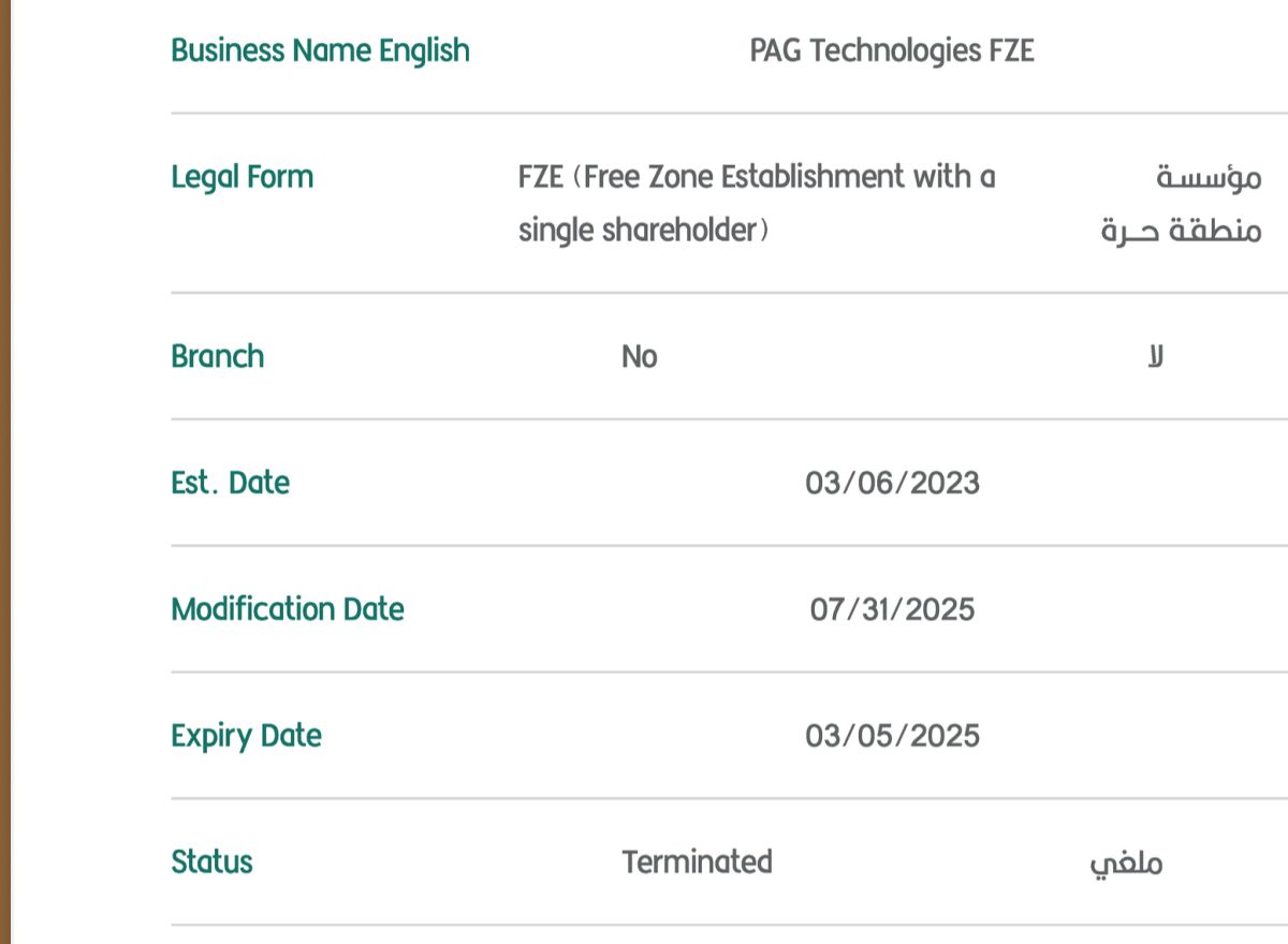 Tu se začne zgodba, o kateri pišemo danes. Marca 2023, torej pol leta po odobritvi denarja, je bilo v Združenih Arabskih Emiratov ustanovljeno podjetje Pag Technologies. Njegove povezave so vodile do Slovenije. Že dva meseca pred tem je namreč neznana oseba v Sloveniji zakupila domeno pag-technologies.com.