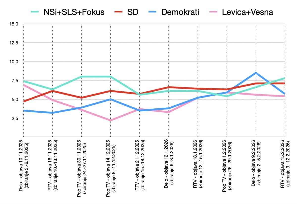 Drugi primer: podpora Levici in Vesni je že od novembra lani praktično enaka podpori Demokratom. V petih anketah, kjer je Mediana obe stranki merila skupaj, je razlika do Logarja v obeh smereh znašala največ 0,3 odstotka.