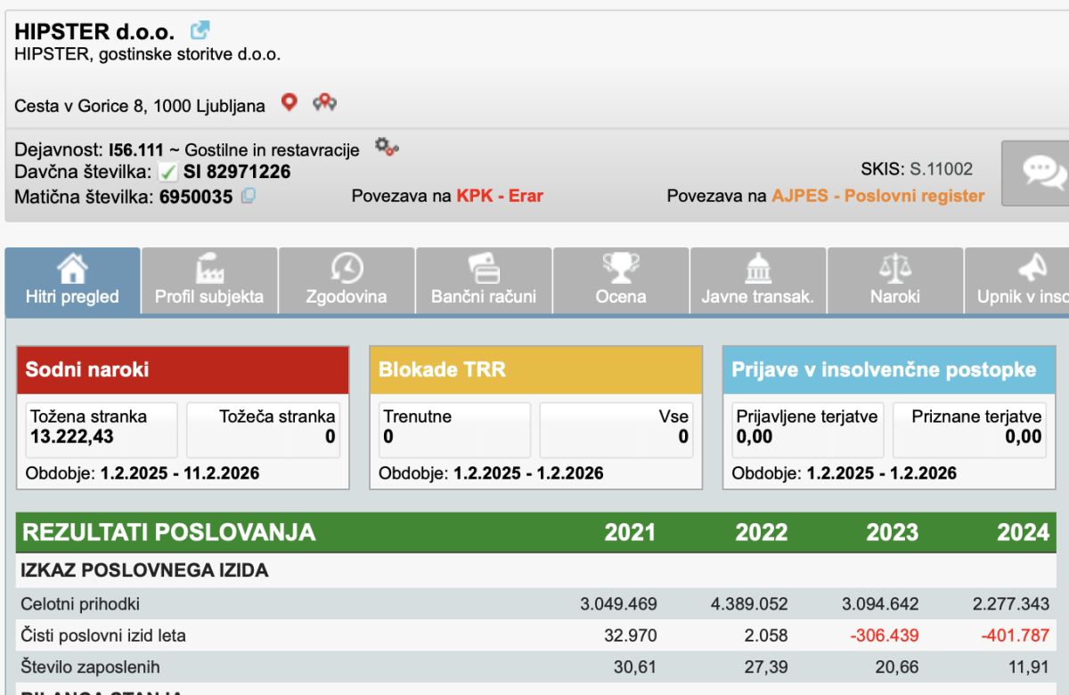 Podjetje Hipster, lastnik verige, je v letih 2023 in 2024 skupaj ustvarilo 700 tisoč evrov izgube. Prihodki, ki so še leta 2022 znašali 4,4 milijona evrov, so bili v letu 2024 za skoraj polovico nižji.