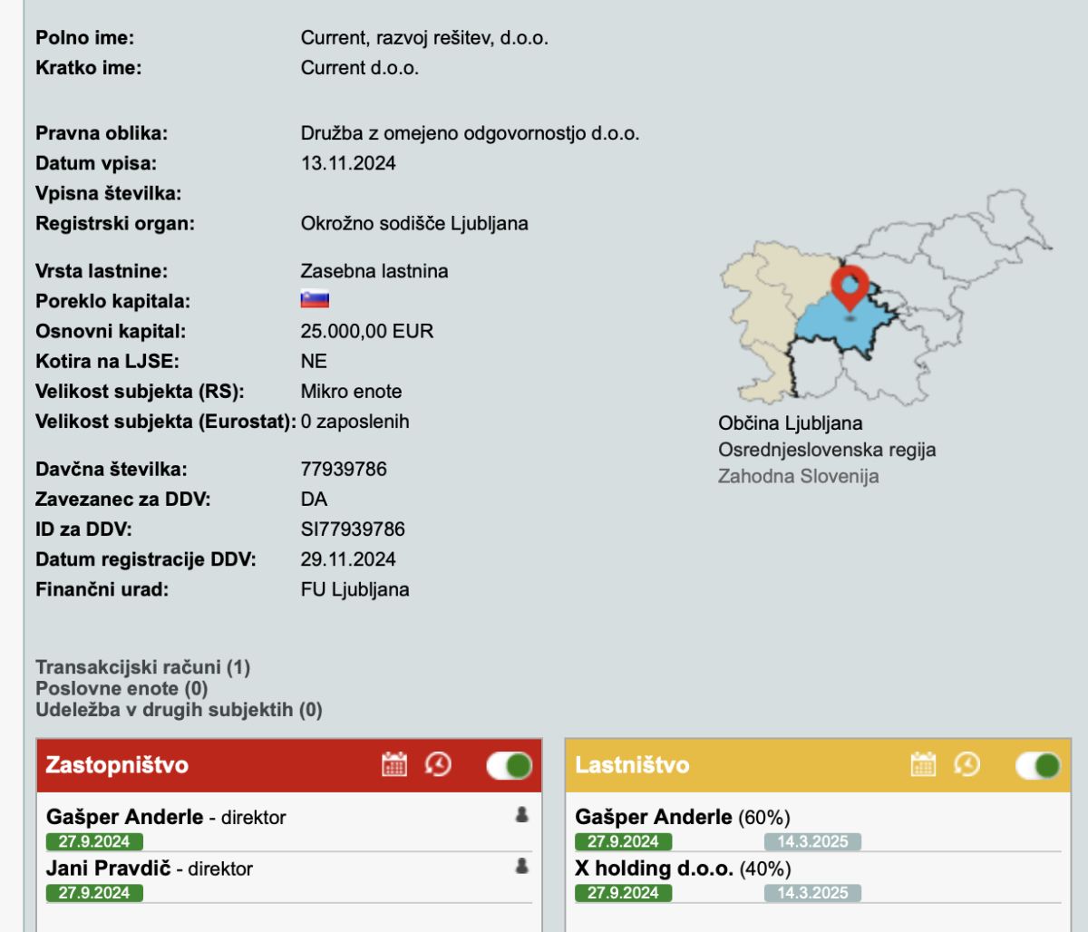 Podjetje Current je bilo ustanovljeno šele septembra 2024, torej tik preden ga je Pravdič ponudil za pomoč.