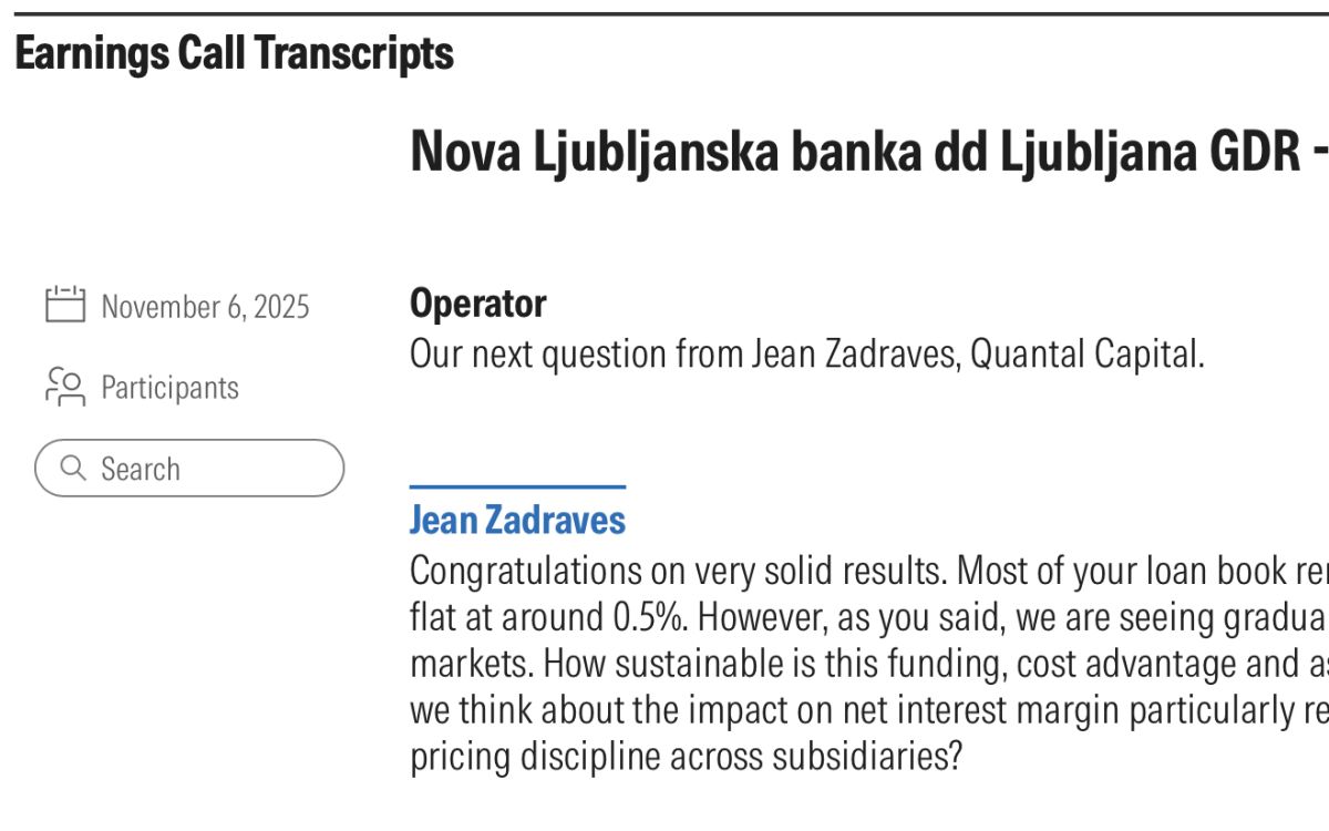 Za družbo Quantal Capital sicer kot "investicijski analitik" dela Žan Zadravec. Na nedavni spletni investicijski konferenci je v imenu dubajskega podjetja vprašal prvega moža NLB Blaža Brodnjaka, kako dolgo bo banka še lahko ohranjala nizke stroške financiranja in kako se bodo spremembe obrestnih mer odrazile na njenem dobičku.