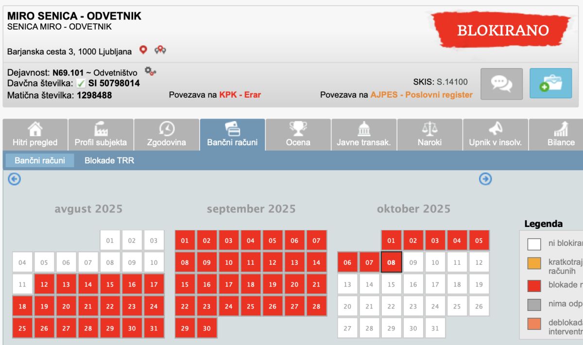 Na Mira Senico in njegovo odvetniško pisarno smo včeraj naslovili več vprašanj. Zanimalo nas je, zakaj so imeli v avgustu in septembru večkrat blokirane račune, ali so poravnali dolgove do teh upnikov, ali imajo neporavnane obveznosti do države oziroma obveznosti, za katere so se dogovorili o odlogu plačila, in koliko te znašajo. Odgovorov nismo prejeli.