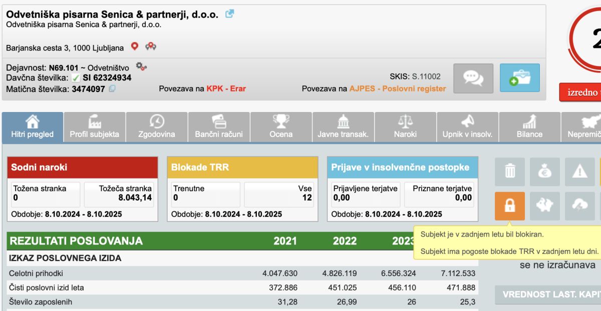 Omeniti velja še en podatek: leta 2022 je imela odvetniška pisarna za 142 tisoč evrov finančnih odhodkov, večinoma obresti na bančna posojila. V lanskem letu pa je ta številka presegla 800 tisoč evrov. To nakazuje, da je morala plačevati zelo visoke obresti za posojila, ki so lahko na sivem trgu v Sloveniji višje od 15 odstotkov.