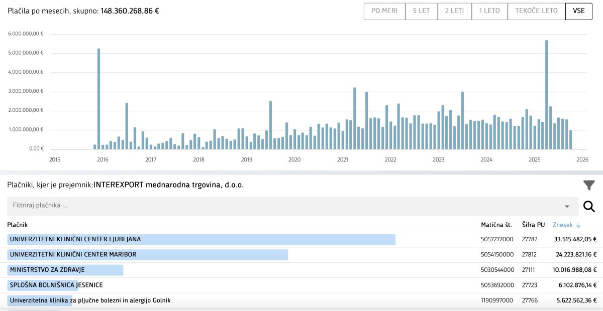 Jenčičev Interexport je že vrsto let eden od največjih dobaviteljev domačega zdravstva, a medijskih zapisov o njem ni veliko. Podjetje letno beleži dobrih 60 milijonov evrov prihodkov in zaposluje okoli 80 ljudi. V zadnjih štirih letih je skupaj ustvarilo več kot 13 milijonov evrov dobička. Pri tem so mu v pomembni meri pomagali tudi posli z javnimi naročniki. Od teh je v desetih letih prejel skoraj 150 milijonov evrov, največ od UKC Ljubljana, UKC Maribor in ministrstva za zdravje.