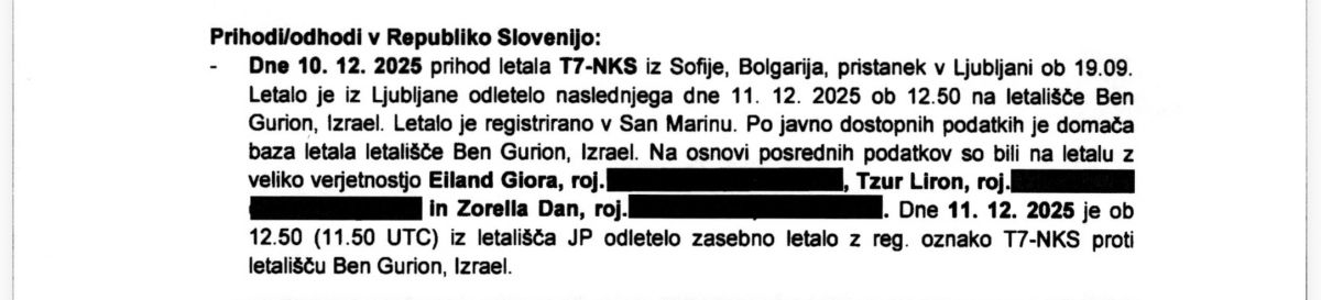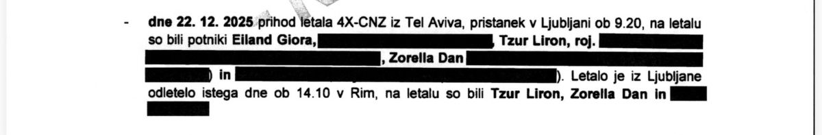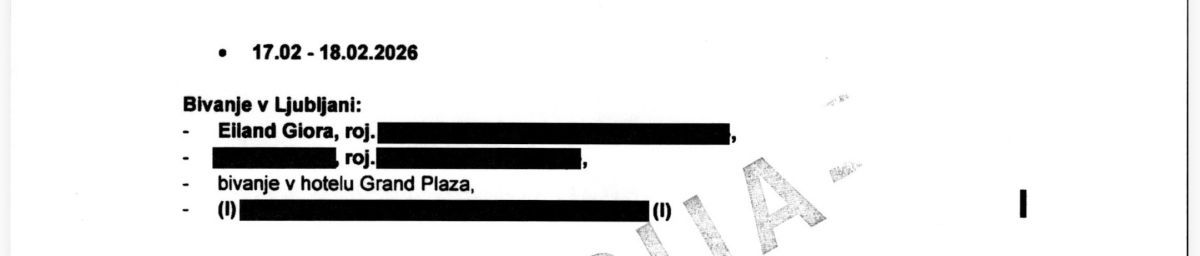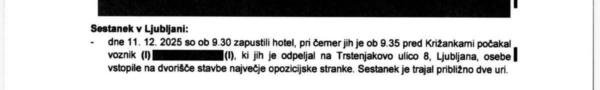 "Dne 11. 12. 2025 so ob 9.30 zapustili hotel, pri čemer jih je ob 9.35 pred Križankami počakal voznik (ime prikrito, op. a.), ki jih je odpeljal na Trstenjakovo ulico 8, Ljubljana, osebe vstopile na dvorišče stavbe največje opozicijske stranke. Sestanek je trajal približno dve uri," navaja dokument. Že isti dan ob 12h50 so se z letalom vrnili v Izrael.